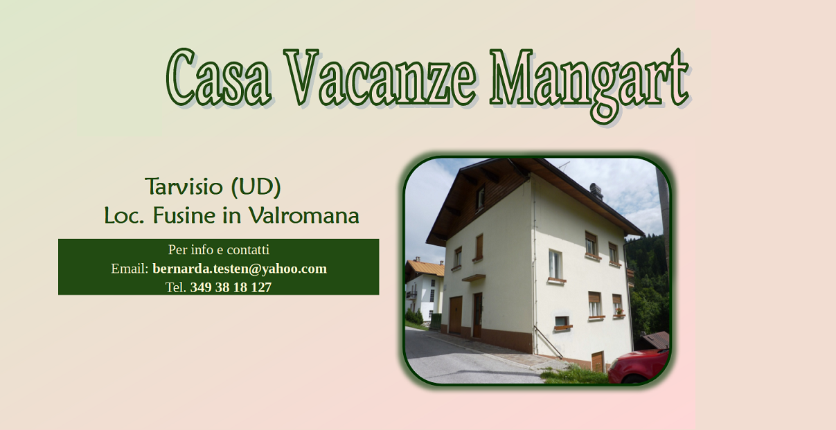 Casa vacanze Mangart rif. sig. Bernarda Testen --- 33018 Tarvisio (UD), Loc. Fusine in Valromana, via Cavour 48, tel. (+39) 349 38 18 127 email: bernarda.testen@yahoo.com sito web: www.casavacanzemangart.com CIN: IT030117C2XV5SCLIZ - IT030117C29BXMRAQZ |